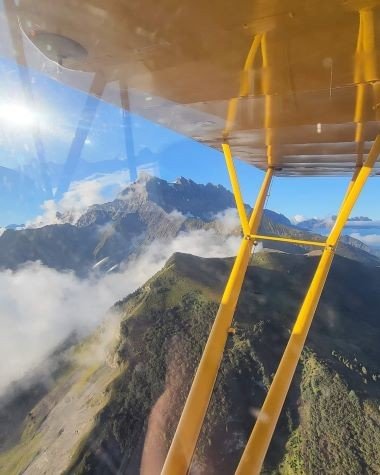 Une fois dans les airs, les vues sont magnifiques, avec les quelques nuages qui s'accrochent aux montagnes.